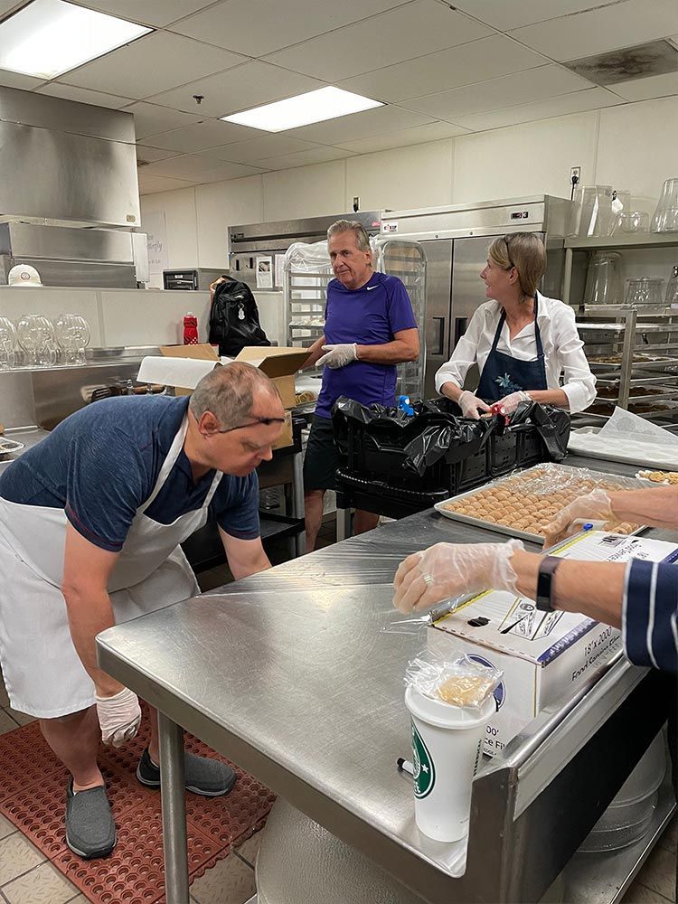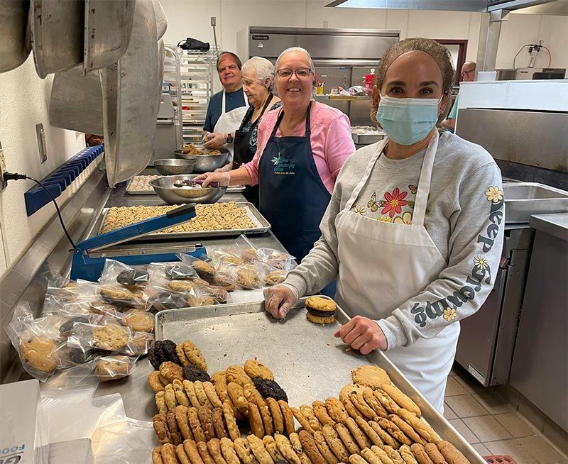 Volunteers prepare and package cookies, muffins, and other baked goods in the Golden Butterfly Bakers kitchen.